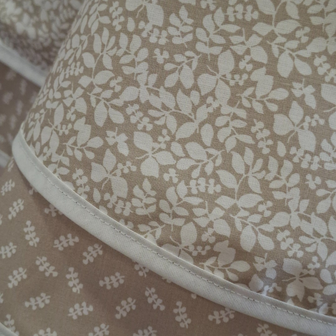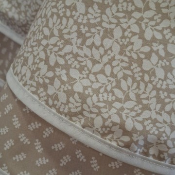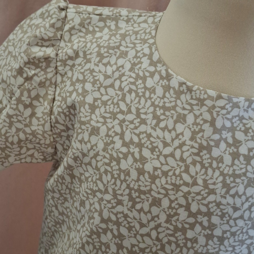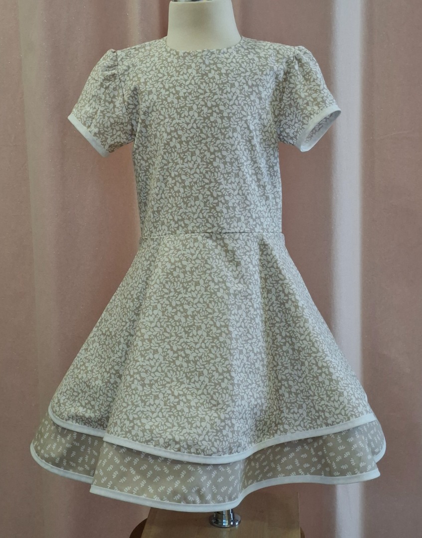 Uniek jurkje in beige kleur met wit bladmotief en onderaan een band met een klein bladmotief.